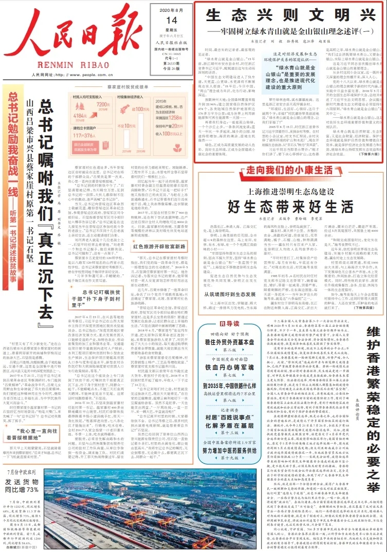 8月14日,《人民日报》在一版报眼显著位置发表文章《生态兴则文明兴——牢固树立绿水青山就是金山银山理念述评(一)》,称引包铝近年来加强环保工作取得的显著成果,这是对包铝认真贯彻落实“绿水青山就是金山银山”理念,以高度的认识自觉和行动自觉推进环保工作、加强环境治理的充分肯定和有力例证。